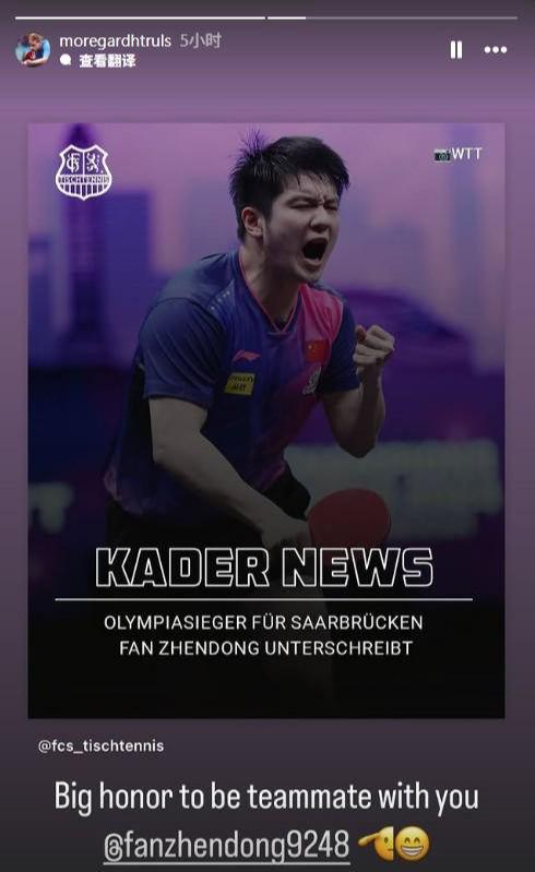 莫雷加德、弗朗西斯卡連忙發文,對樊振東的到來表示熱烈地歡迎;